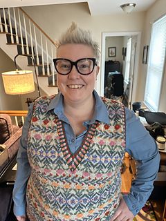 A ladies’ Fair Isle style vest in five sizes using eight colors of fingering weight Jamieson’s of Shetland “Spindrift” Shetland wool yarn, circularly knit in traditional style using steeks, with no reinforcement. This method demands traditional 100% wool yarn, preferably Shetland wool. Superwash wools and non-wool yarns are not suitable for this design, as written.