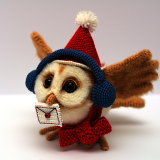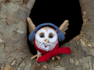 Crochet your own magical barn owl postman or mailman in a Christmas and winter style! This amigurumi owl wears headphones, a warm scarf, and a cozy hat, and even carries a little letter. This toy is the perfect messenger (you can put your letter inside).