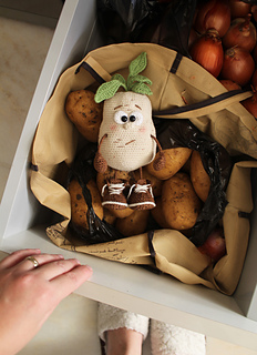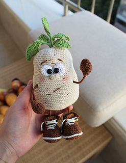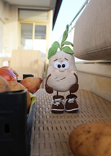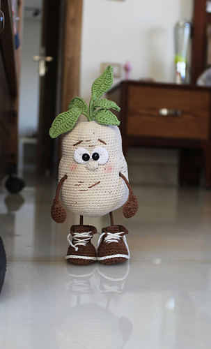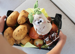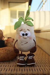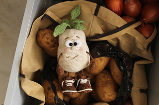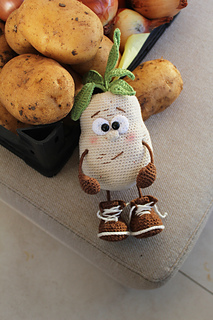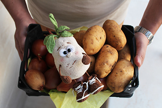 Crochet POTATO toy pattern is in PDF format in English (US terms), German, and Dutch languages.