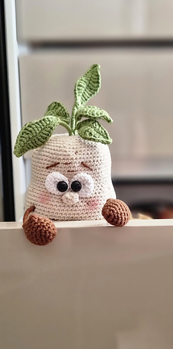 This crochet pattern provides detailed written instructions for creating the potato toy, including the body, arms, legs, branch with leaves.