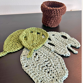 This comprehensive digital PDF pattern includes instructions for three distinct pieces: the classic Teardrop Leaf, the iconic Monstera Leaf, and a sturdy, textured Plant Pot that doubles as a stylish storage container for your coasters.