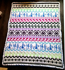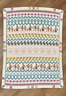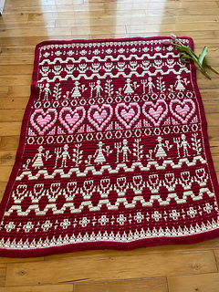 • Large blanket of 193 stitches by 249 rows, which measures 55” by 71” in worsted weight yarn and takes appx 2308 yards of light-colored yarn and 2188 yards of darker yarn to complete.