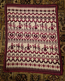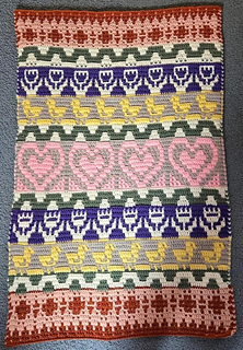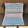 • Small blanket of 97 stitches by 153 rows, which measures 28” by 44” in worsted weight yarn and takes appx 696 yards of light-colored yarn and 692 yards of darker yarn to complete.