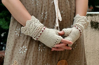 Vintage inspired, these dainty hand warmers boast gorgeous lacy cuffs in a delicate woodsy leaf pattern. Knit in a luxurious, rustic fiber blend of merino wool, angora, alpaca, and silk noils. The hand stitching accents in deep garnet give these unique gloves a real handmade look and feel.
