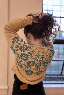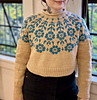 Prairie Rose Pullover is worked from the top down with radiating floral color work, a rolled neckline, and a split hem.