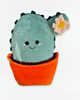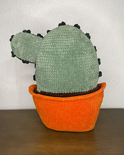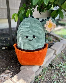 Base of the Cactus Pot is started by using a foundation chain and crocheting on both sides of the chain to create an oval shape. When changing colors, work the final pull- through of the last stitch with the new color. Tie ends of old and new colors together and hide inside pot/soil as you go. Additional details are sewn or embroidered on. Use the larger hook for all sections except the Eyes.