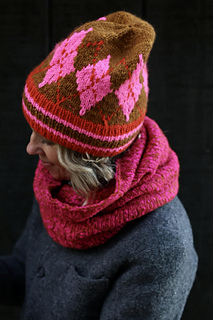 Worn on title page in 1 skein in color Rye (MC), 1 skein in color Smooch (C2), and 1 skein in color Row (C3)