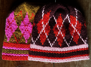 Worn on back page in 1 skein in color Penny Candy (MC), 1 skein in color Row (C2), and 1 skein in color Mitzi (C3)