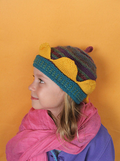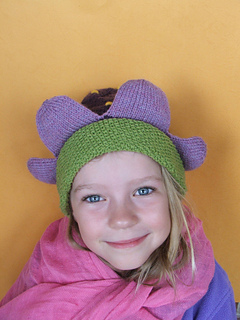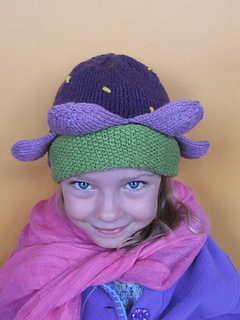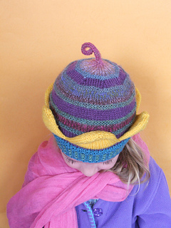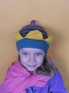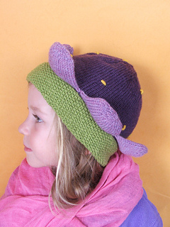 A flower hat to please any little girl. Two versions are provided. One has a seed stitch band and a plain crown embroidered with bullion stitch. The other has a slip stitch pattern band and a stripey crown with an I-cord swirl.