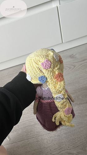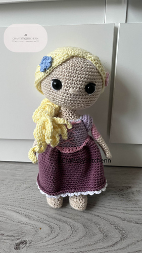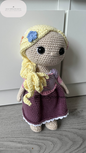 Crochet your very own Rapunzel-inspired doll (approx. 25 cm tall), featuring her long golden hair, a flowing purple gown, and delicate details. This project is assembled from separate parts and decorated with optional flower accents to complete her fairy-tale look.