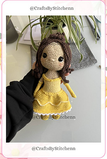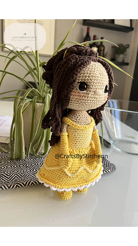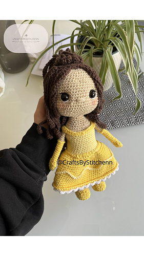 Head & Body – Crocheted in continuous rounds with beige yarn for the skin and light yellow for the dress body. The body transitions into a bell-shaped skirt using increasing rounds.
