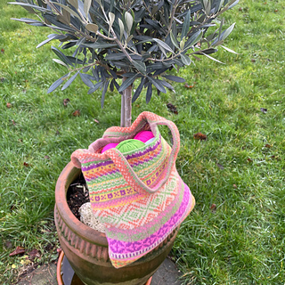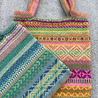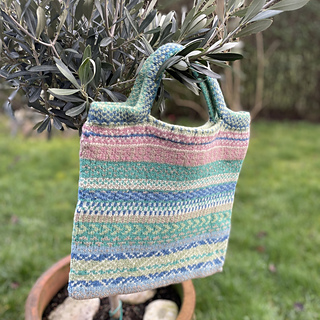 mønster-strikkede projekttaske er virkelig sjov at strikke fordi du kan lege med mønstre og farver. Du sammensætter dine egne mønstre og farver ud fra nogle mønsterforslag i opskriften. Det gør den mere personlig og helt din egen.