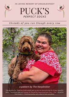 These socks are a tribute to my late knitting friend Puck, also known as Draadjesfeest and half of the proceeds of this pattern will be donated in her name to the assistance dogs association “Bultersmekke”.