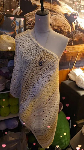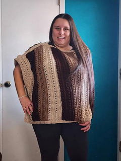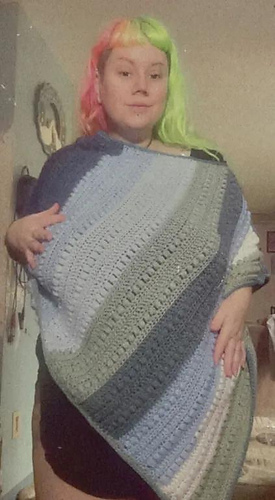 Puff Puff Pass as a Poncho. This is an easy pattern to begin constructing wearables. Weight 3 or 4 yarn are options.