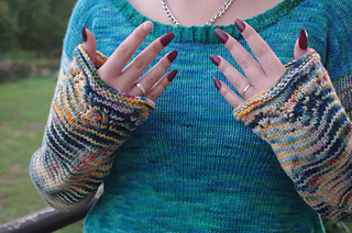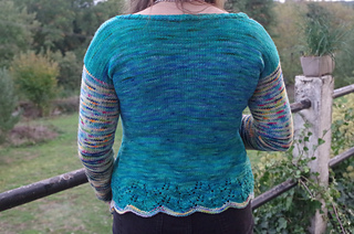 Un modèle assez simple avec une forme un peu évasé sur les hanches, une petite dentelle et beaucoup de jersey qui laisse place à la magie des laines teintés par La roulotte des laines.