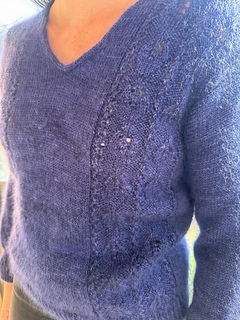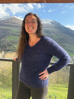 Le corps, volontairement sobre, met en valeur les nuances du fil tandis que deux panneaux de dentelle viennent encadrer le devant du pull. Inspirée de délicates feuilles, cette dentelle se déploie le long du buste et des épaules, apportant relief, poésie et élégance au modèle.
