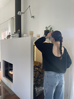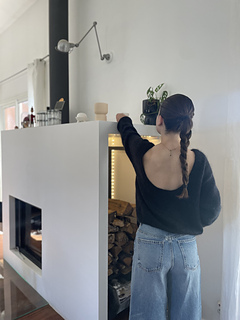 Le pull est présenté en taille S: effet loose sur une taille 34, moins sur une taille 36/38.
