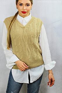 This vest is worked bottom-up, with a seamless ribbed hem and simple finishing. The cable motif is placed only on the front, while the back is worked in plain stockinette for a clean look and easy knitting rhythm.