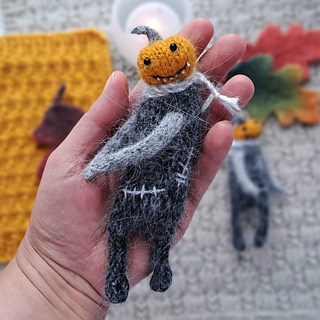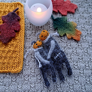 The dolls are worked in the round using double-pointed needles, with additional techniques for shaping and finishing. The design combines playful proportions with seasonal details, making it suitable for decorative use.