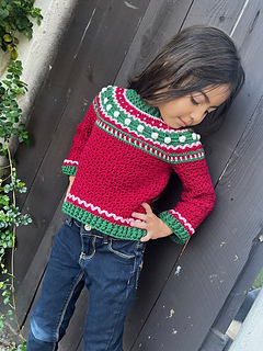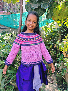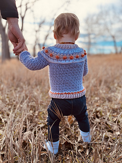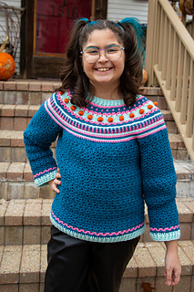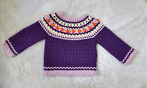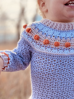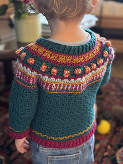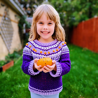 This is a unique, fair isle effect crochet sweater for children aged 1-10 years. It uses dk weight yarn, and features a special stitch, the pumpkin stitch, which is my own invention. The stitch is much quicker than embroidering all the pumpkins.