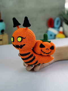 Pumpkin Snail is a playful amigurumi design featuring a small snail carrying a pumpkin shell.