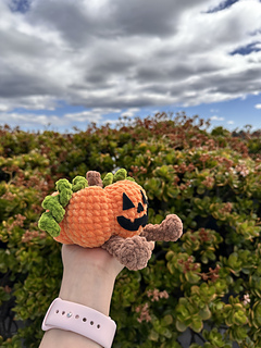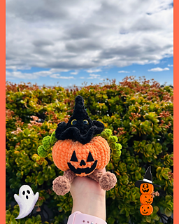 - Yarn colours: Orange (Pumpkin), Green (Tendrils), Brown (Legs and Stem) and Black (Hat).