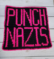 Pattern is worked in single crochet from bottom to top. 10inx10in using worsted weight yarn, if you were to use a larger yarn and a larger hook you could make this larger. You will need a 3.5 mm hook, yarn, a yarn needle, and scissors. 2 different colors of yarn, 1 for the background color and 1 for the color of the words and the outer edge.