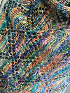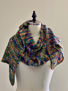Pure Geometry is a light weight rectangular wrap featuring diamond motifs offset by a double trellis stitching. This design is for all of those knitters (myself included) that cannot resist a colorful variegated fiber. Your color combinations will show up differently on each diamond making this a fun knit. To make it even better once you do a repeat or two you will know exactly where you are in the pattern and stitching errors will show immediately allowing for a quick fix. Style Pure Geometry as a traditional wrap or sling artfully around your neck for a pop of color. Choose to do a basic bind-off or add 200 yds of either your main color or a contrasting color for an I-cord bind off.