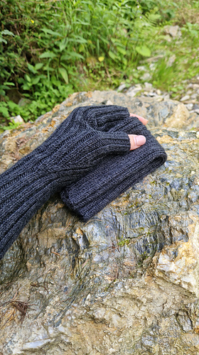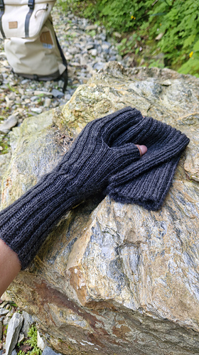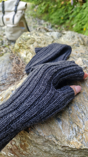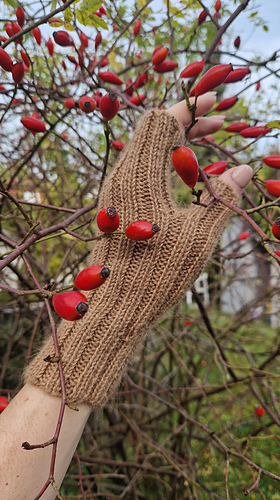 Die Handstulpen werden von der Manschette zu den Fingern im Rippenmuster gestrickt. Durch gezielte Zunahmen an der Seite entsteht ein keilförmiger Einsatz für den Daumen.