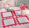 Four white filet squares with red edging joined into doily