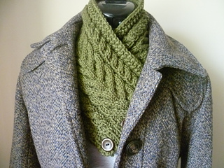 ‘An aran cable neckwarmer with a central staghorn cable and four-button fastening’