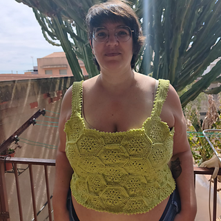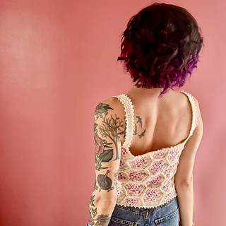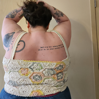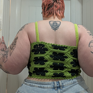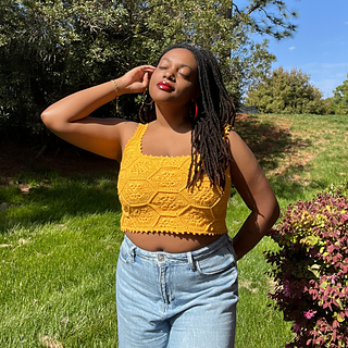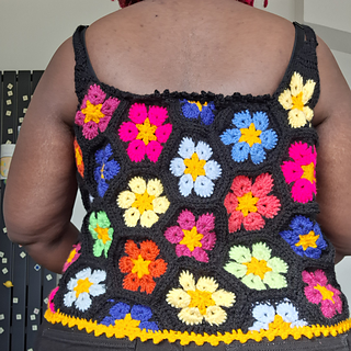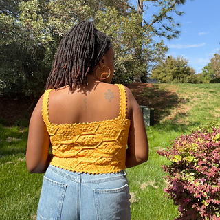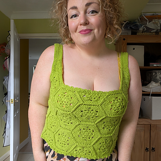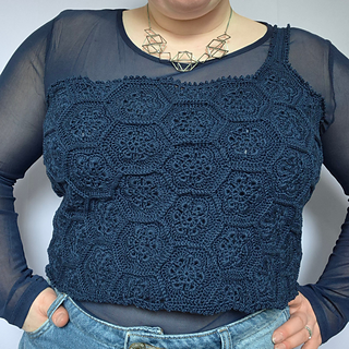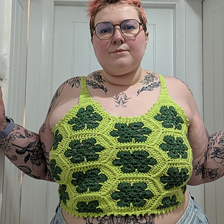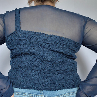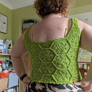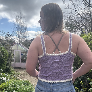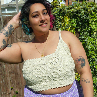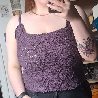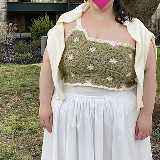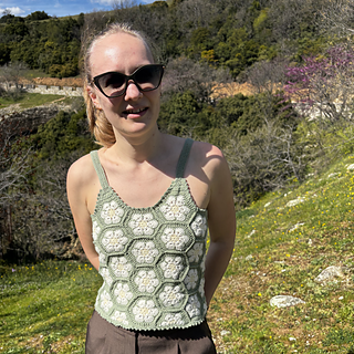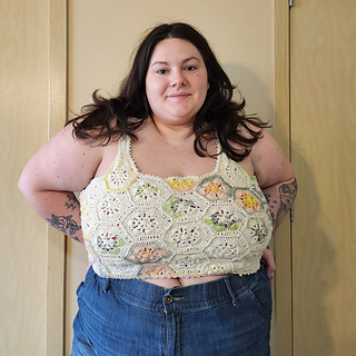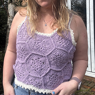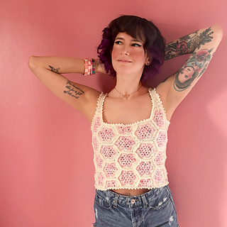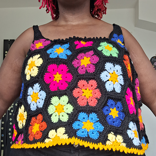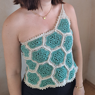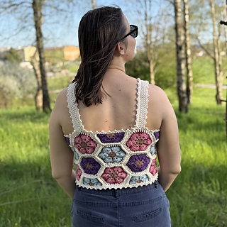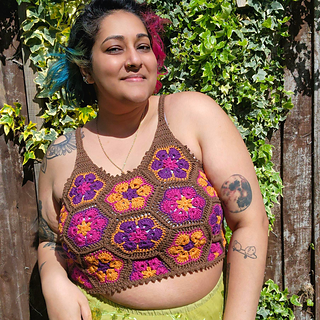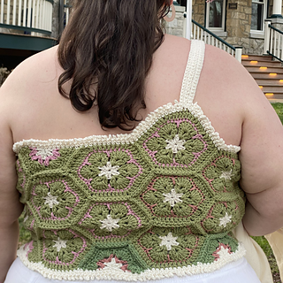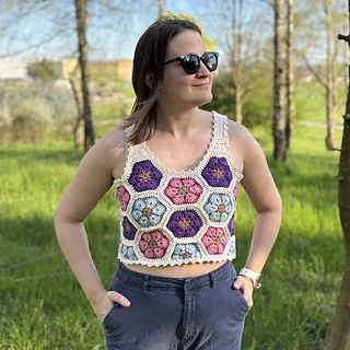 The Queen Bee Top is a honeycomb patchwork top with a beautiful floral design. Optional asymmetrical or regular straps, this is a fun top perfect for spring and summer or layering in the colder months. This is a no sew pattern using the join as you go method.