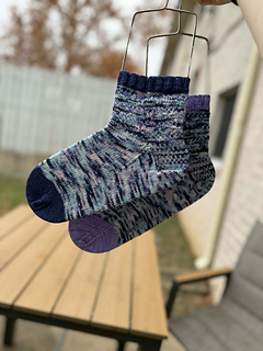 The Quicksilver Socks is a super fun sock design created in collaboration with the 2025 New Years Eve boxes from Fantasy Fibers Yarn Co inspired by the novel Quicksilver. The socks have a contrasting cuff and toe, as well as some criss-cross cabling texture and mosaic colourwork throughout the leg of the sock. The texture and colourwork are inspired by the book cover, with the butterflies and pops of colour. The socks are knit cuff down, with a heel flap and gusset, and an anatomical toe.
