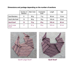 Trick : With one skein of fingering weight yarn in the main color and one skein of a contrasted color, you can knit a Quoll Large Scarf plus a smaller one with the main color and contrasted color inverted