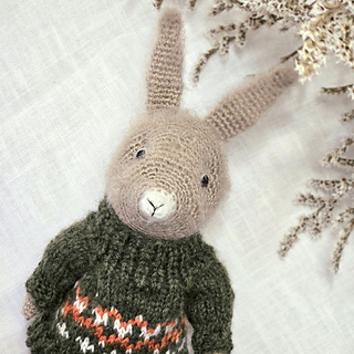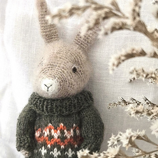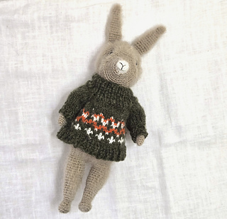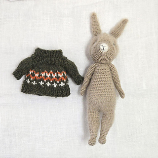 The rabbit’s body and head are crocheted, while the sweater is knitted from the top down using a raglan construction.