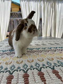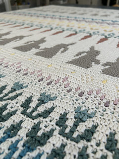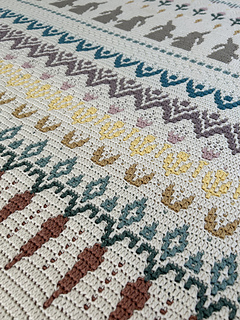 Welcome to the Rabbit’s Garden Blanket! This pattern uses mosaic crochet to create a whimsical and sweet garden scene. When I designed this pattern, I felt very inspired by the curious and playful nature of my rabbit, Fergal. The repeating rows of carrots, fresh greenery, and hopping bunnies remind me of watching him explore the garden with boundless energy, sniffing out treats and adventures around every corner. Once you get the hang of things, you are welcome to adjust the size by changing the number of repeats—this pattern works in multiples of 24 stitches, so the sky is the limit! I had so much fun experimenting with earthy colors in this blanket and using art to capture the joy animals bring to our lives. I hope you feel inspired to create your own Rabbit’s Garden Blanket and enjoy the magic of connecting nature and crochet to make something beautiful and unique.