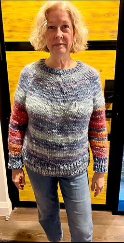 Ce pull est tricoté d’une seule pièce, de haut en bas. Il a des rangs raccourcis pour rehausser le dos.