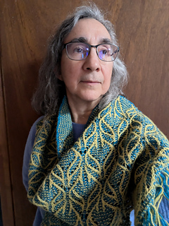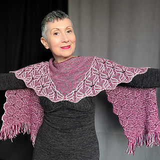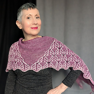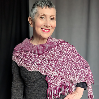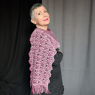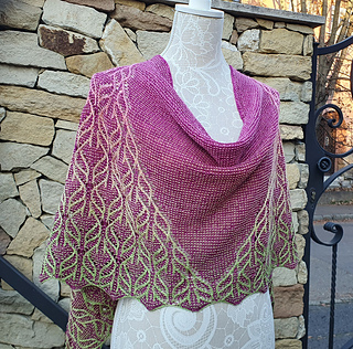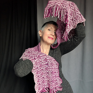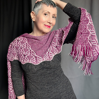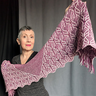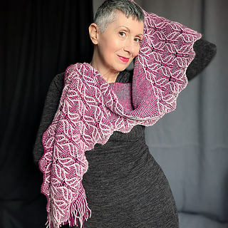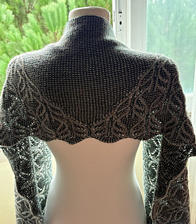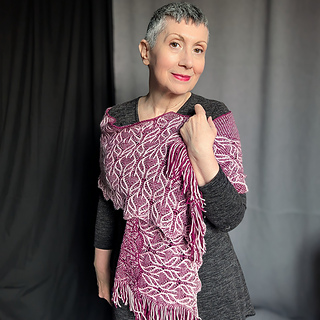 This stole is worked from the bottom up in the round. The stitch pattern transitions from a richly textured lace panel at the bottom to a simple garter-based section at the top, creating the illusion of a triangular shawl embedded within a rectangular shape.