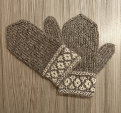 Eight years ago, my mother moved from her house into an apartment. I was asked to take care of her school books from the time she attended weaving education at Høgtun. Careful notes she made of weaving patterns with explanations. I have for a long time thought that these could also be used as knitting patterns. The pattern on the coffins is taken from the chapter Rosebragd. On the mitten itself and the thumb, I used a slip-pattern that is often used to reinforce heels, this creates an almost double layer of threads, making the mittens denser and warm.