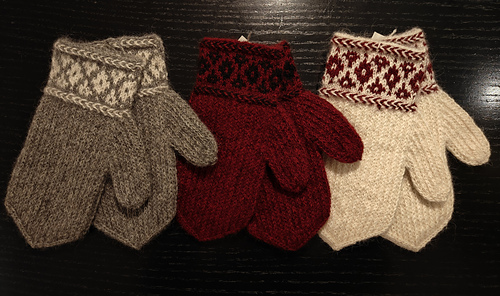 Mønsteret på mansjetten på disse vottene er hentet fra kapittelet «Rosebragd». På selve vottebladet og tommel har jeg brukt et flyttemønster som ofte blir brukt for å forsterke hæl. Dette gir et nær sagt dobbelt lag av tråder og votten blir tettere og varm.