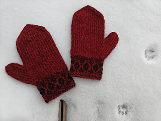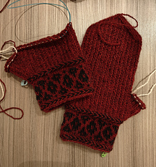 Yarn: I have knitted two samples for the pattern. The first sample is knitted with Hoelfeldt Lund`s weaving yarn, well suited for knitting that gives a soft and warm result. The gray sample in Hoelfeldt Lund weigh about 85 grams, with an estimated amount of contrast color of about 30 grams. Link to Hoelfeldt Lund: https://www.spinnerigaarden.no/butikk/garn The second example is knitted with Hillesvåg Sølje, a pelt wool yarn, resulting in a soft and lovely finish. Link to Hillesvåg wool factory: https://ull.no/produktkategori/garn/solje-pelsullgarn The red example weighs about 80 grams of Sølje main color and about 25 grams of Sølje contrast color from Hillesvåg wool factory, or equivalent for tension. Finull from Rauma will also work well for this pattern. Link to Finull Rauma: https://www.raumagarn.no/produkt/garn/finull Gauge: Both yarns have a length of 350 meters per 100 grams and a stated gauge of 25 sts x 32 rows = 10 x 10 cm on 3 mm needles. In this pattern, I also use a slip-stitch pattern that gives a gauge in the pattern: 27 stitches x 38 rows, 10x10 cm with 3.5 mm needles. You will need: Needles, double-pointed needles (set 5 pcs) 3.5mm or 60 cm circular needle, 3.5mm for magic loop 2 removable markers measuring tape needle for securing threads optional crochet hook for picking up stitches extra yarn about 15-20 cm long to set aside thumb stitches