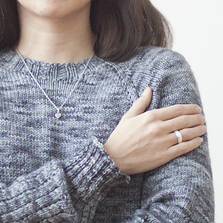 This raglan sweater is worked in the round from the top down, with short rows to raise the back neck. It has a slightly lower arm opening. And a delicate rainfall stripe pattern decorates the lower body, running down into the ribbed hem.