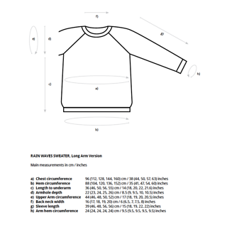 The RAIN WAVES sweater comes in five sizes, which are described as 1 (2, 3, 4, 5). These sizes correspond to the sizes S (M, L, XL, XXL). The pattern photos show a size 1 with 16 cm / 6.3 inches positive ease at the chest.