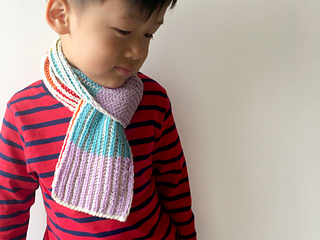 This is a two colour brioche stitch technique with the main colour in ivory and contrasting with colours of the Rainbow. The Brioche stitch creates a very squichy and thick, double-sided, and very pretty fabric that’s warm and cosy as a scarf. You can also add more stitches and make it longer for older children or adult size.