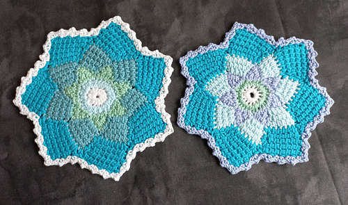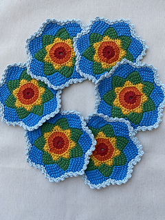 Diameter of the coasters is about 5.1 inches (13 cm), and they are shaped as a flower doily.