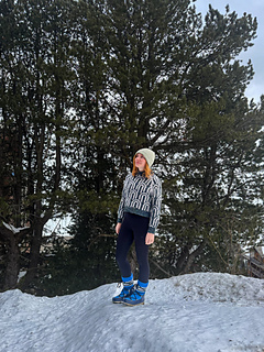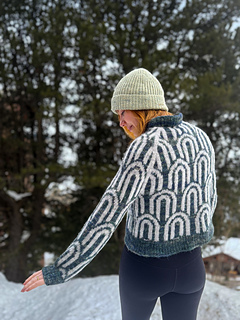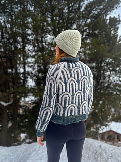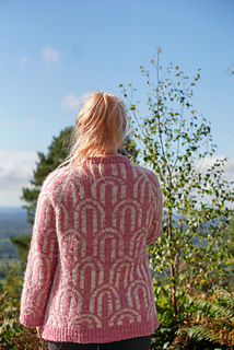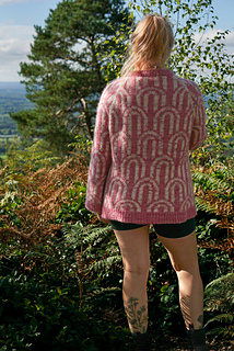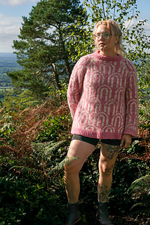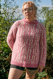 The Rainbow Jumper is an oversized, cozy, colourwork jumper. It’s knit top down in the round, with a raglan construction. You start by knitting a folded collar, then knit short rows to raise the back of the neck a bit, before increasing the yoke of the sweater using a raglan sleeve construction. You then split the sleeves and the body, finish knitting the body in the round before picking the sleeves back up again. Each section of the raglan part of the construction has individual charts for your size. There are two options for body length, as well as the option for a regular or a balloon sleeve.