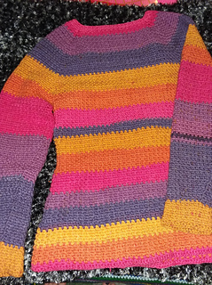 This pattern is for a raglan pullover in single crochet. It suggests multiple colors of A (scarlet), B (hot pink), C (turquoise), D (maize), E (green) and F (purple).