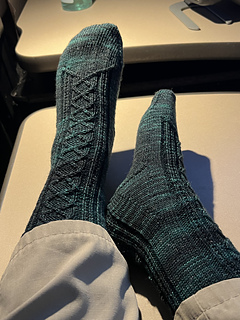 The top-down sock has a patterned back. The toe-up sock has a plain stockinette back.