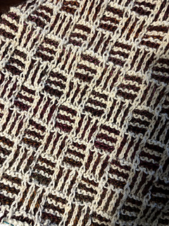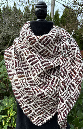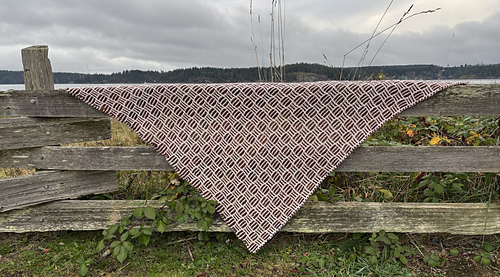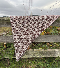 Raven This Way n’ That… Commencing with an I-cord tab cast-on, it then works from a small point, with increases at the end of every right-side row, ending as a generous triangle with an I-cord cast-off. This unique, mosaic, slip stitch pattern creates an interesting result, with stitches seeming to go this way n’ that.