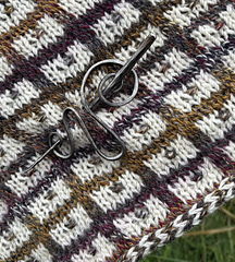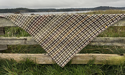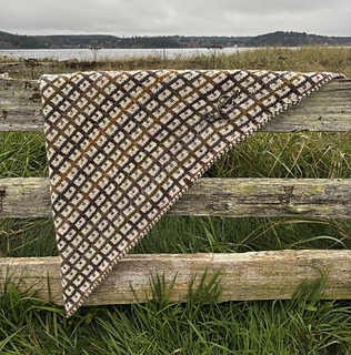 Raven Windowpanes… looking out onto the horizon. Commencing with an I-cord tab cast-on, it then works from a small point, increasing at the end of every right-side row, ending as a generous triangle with an I-cord cast-off. The slipstitch pattern works up quickly and is an easy repeat pattern for a comfortable, pleasant afternoon of knitting. The lovely rustic yarn, home grown in Mecthosin on Vancouver Island, which I purchased at the 100 Mile Fleece and Fibre event a year ago, adds generous texture to this shawl.